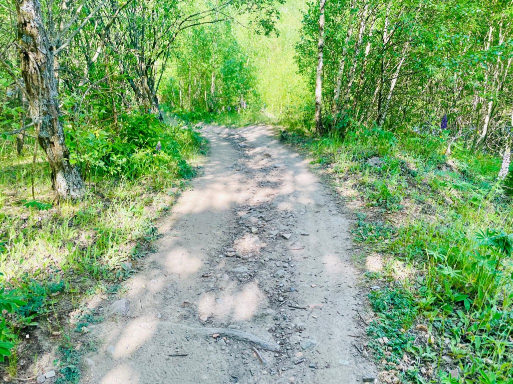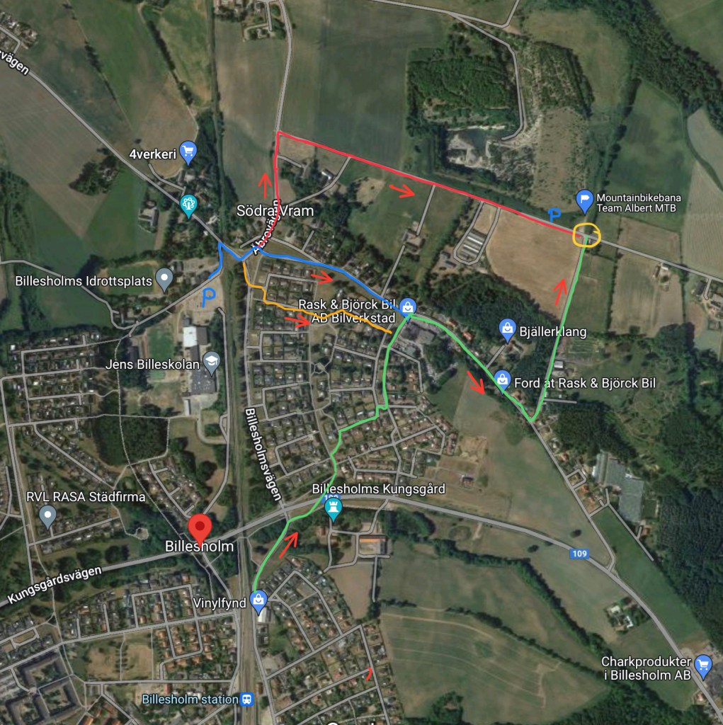 Har du cyklat lite innan så starta vid blå start och följ sedan de röda pilarna efter det, så får du 6,5 km då det i är en slinga med olika spårval. Vill du ha en lite lugnare runda så följ blå pilar.